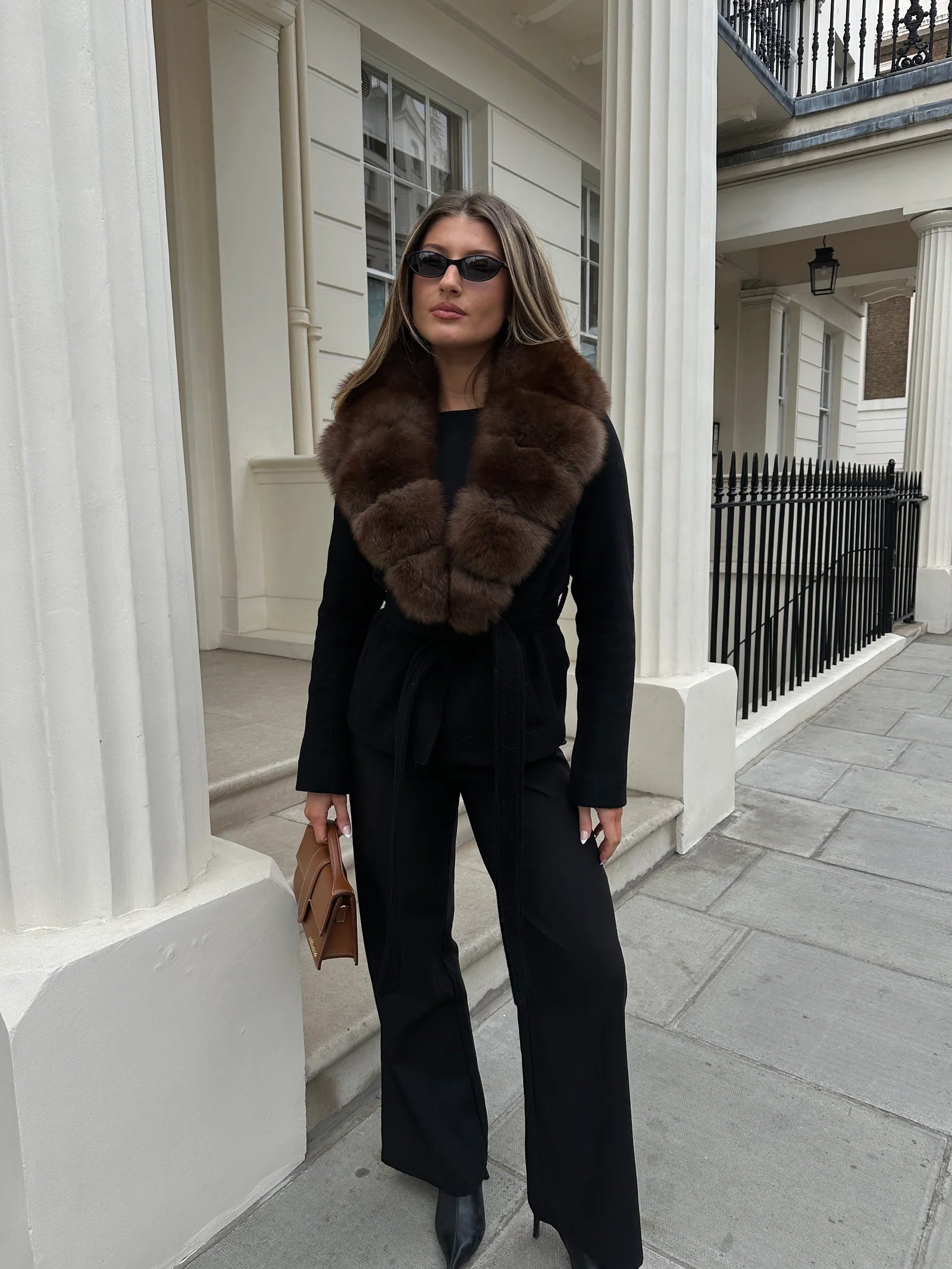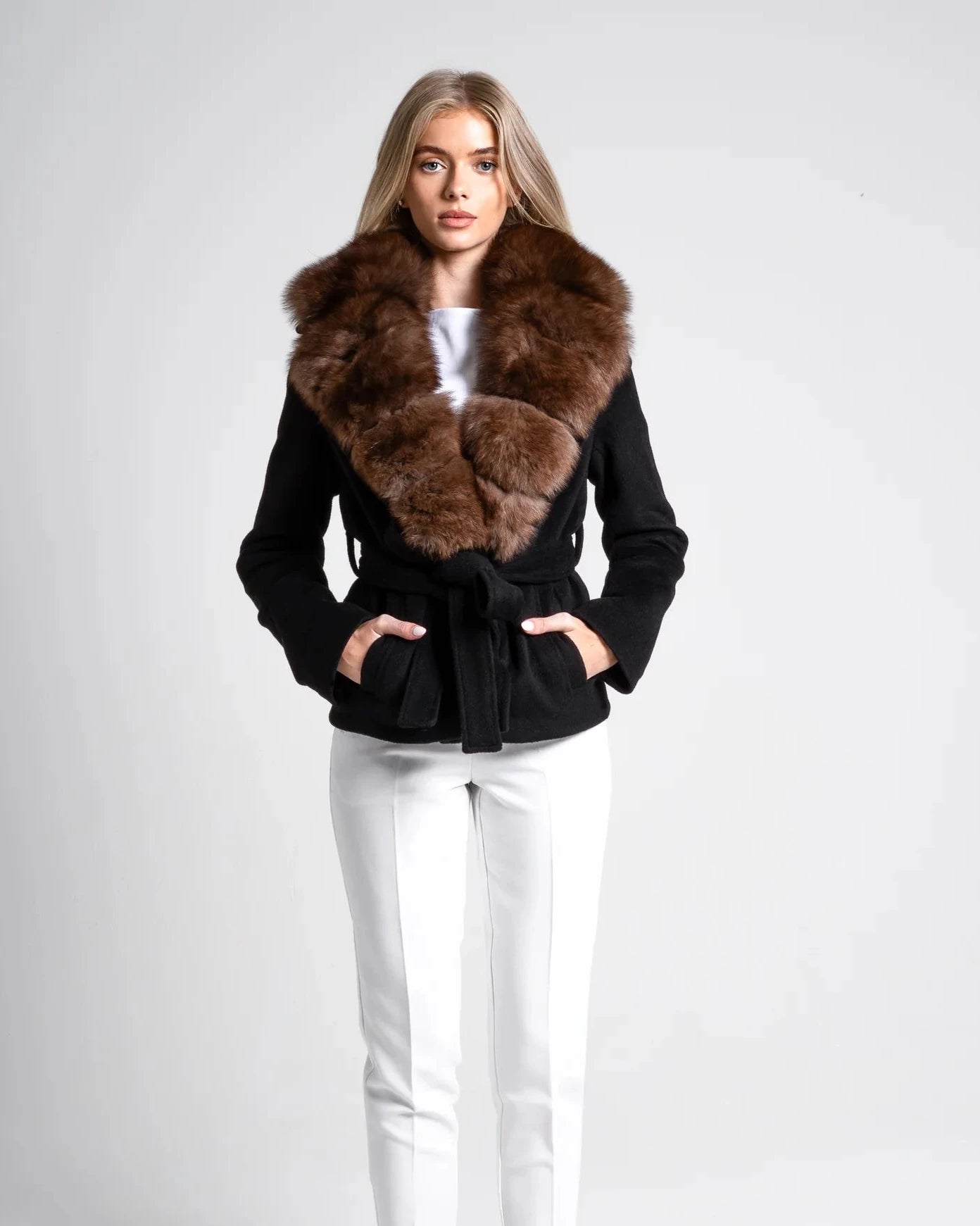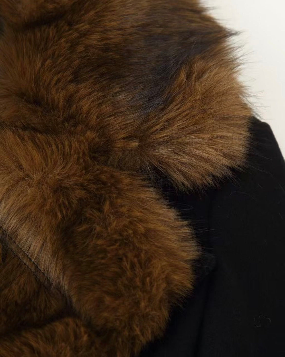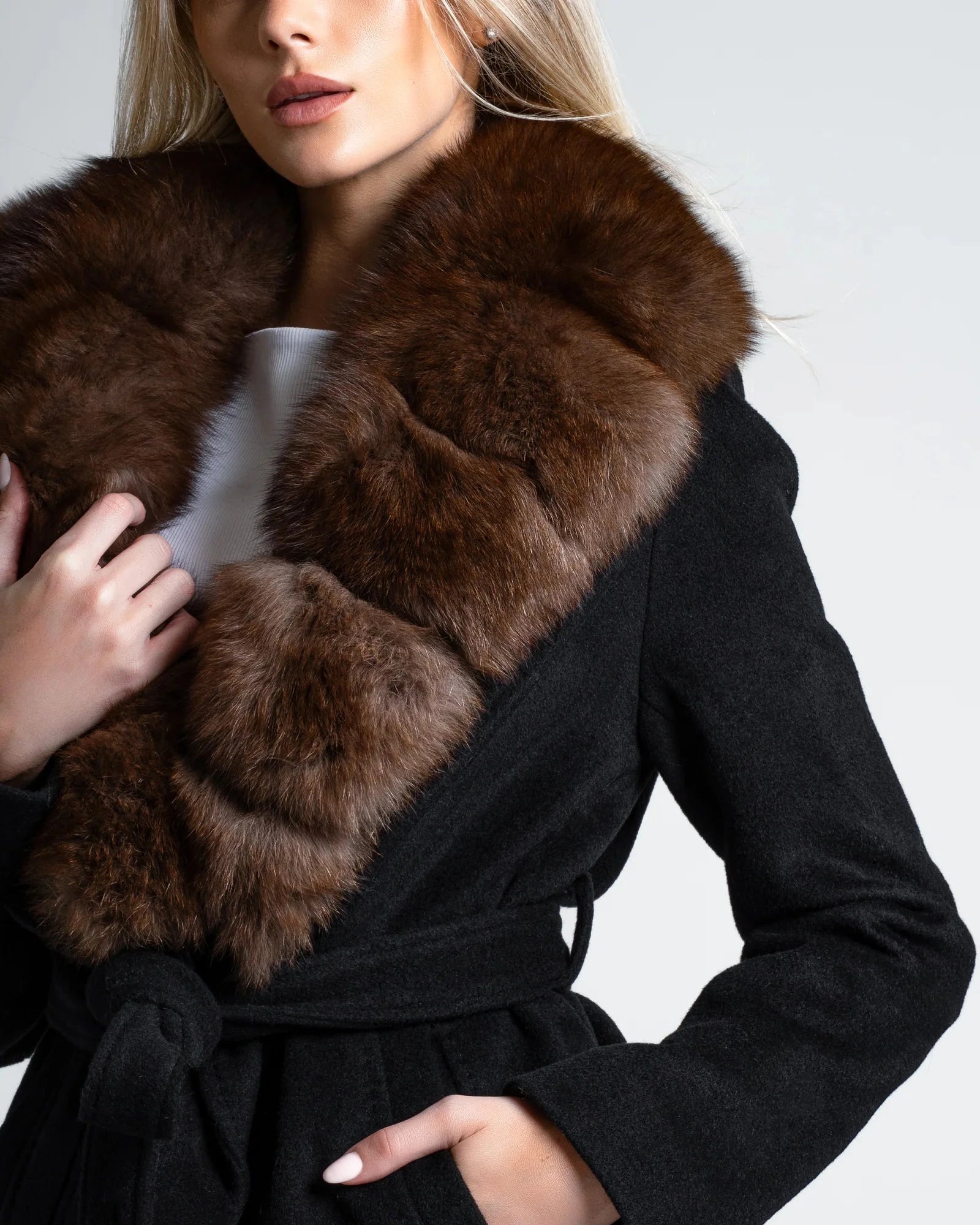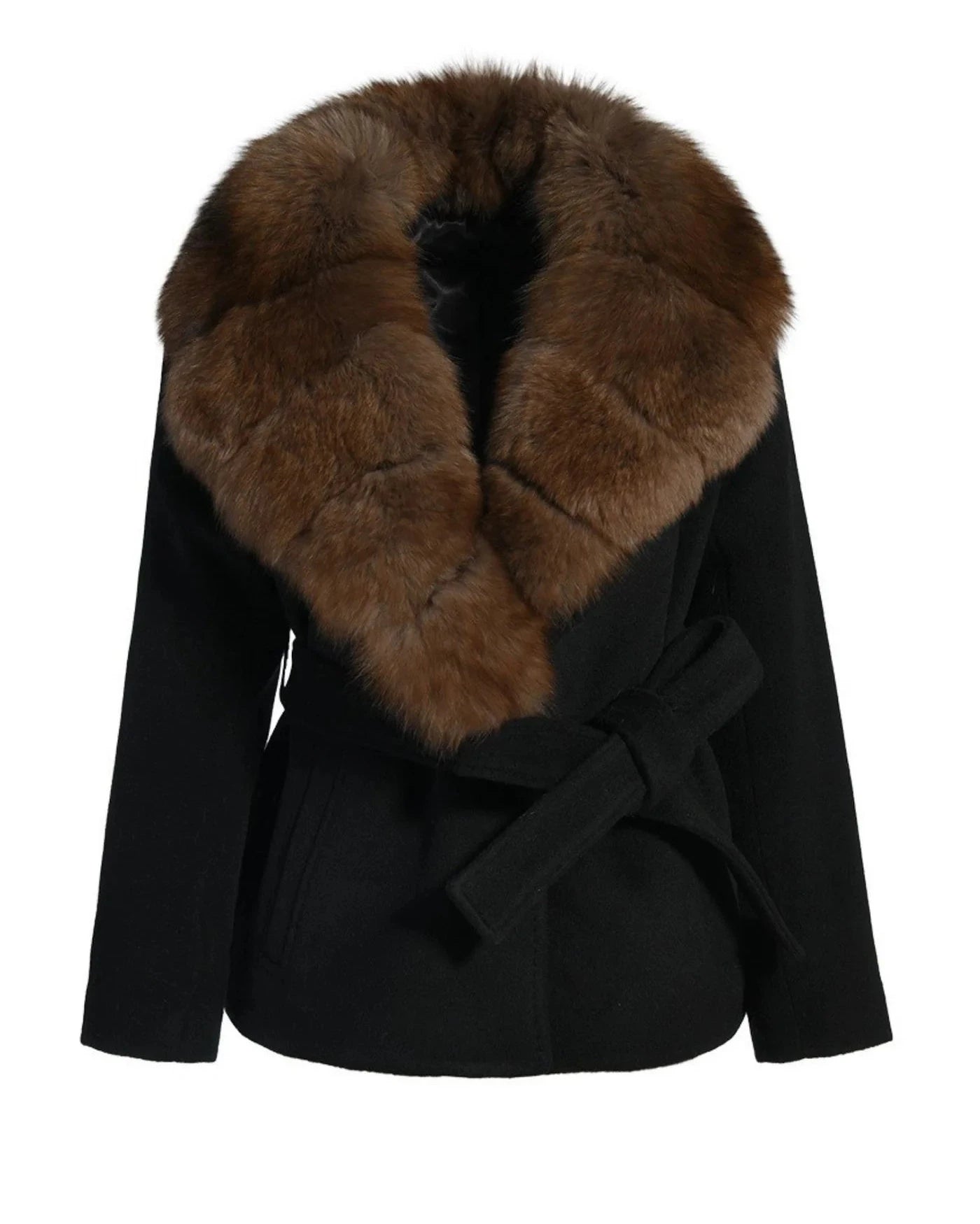 Rich, deep, and undeniably refined, the Renesmie Coat is defined by a sleek black silhouette contrasted with a removable fox fur collar in deep espresso coffee tones.