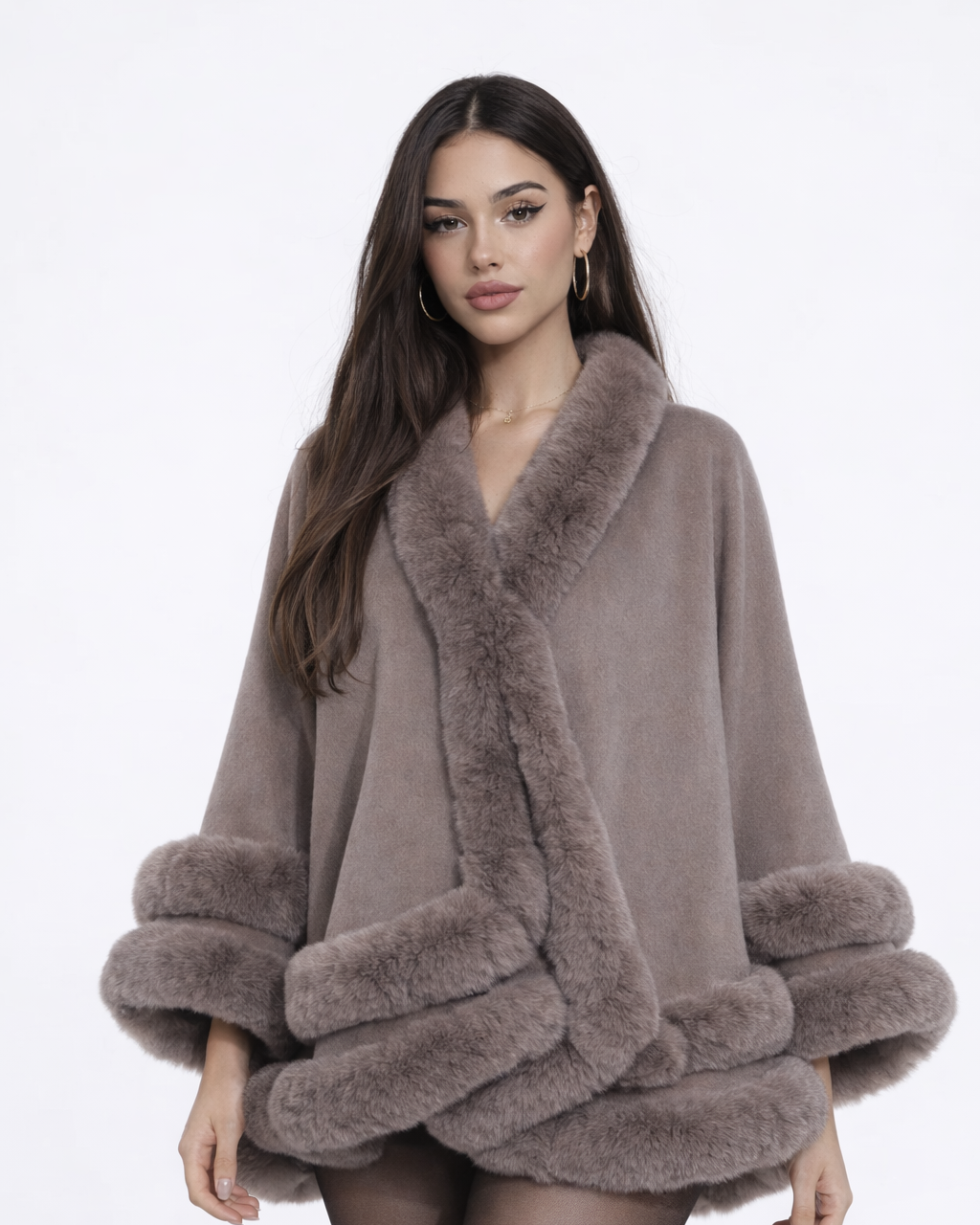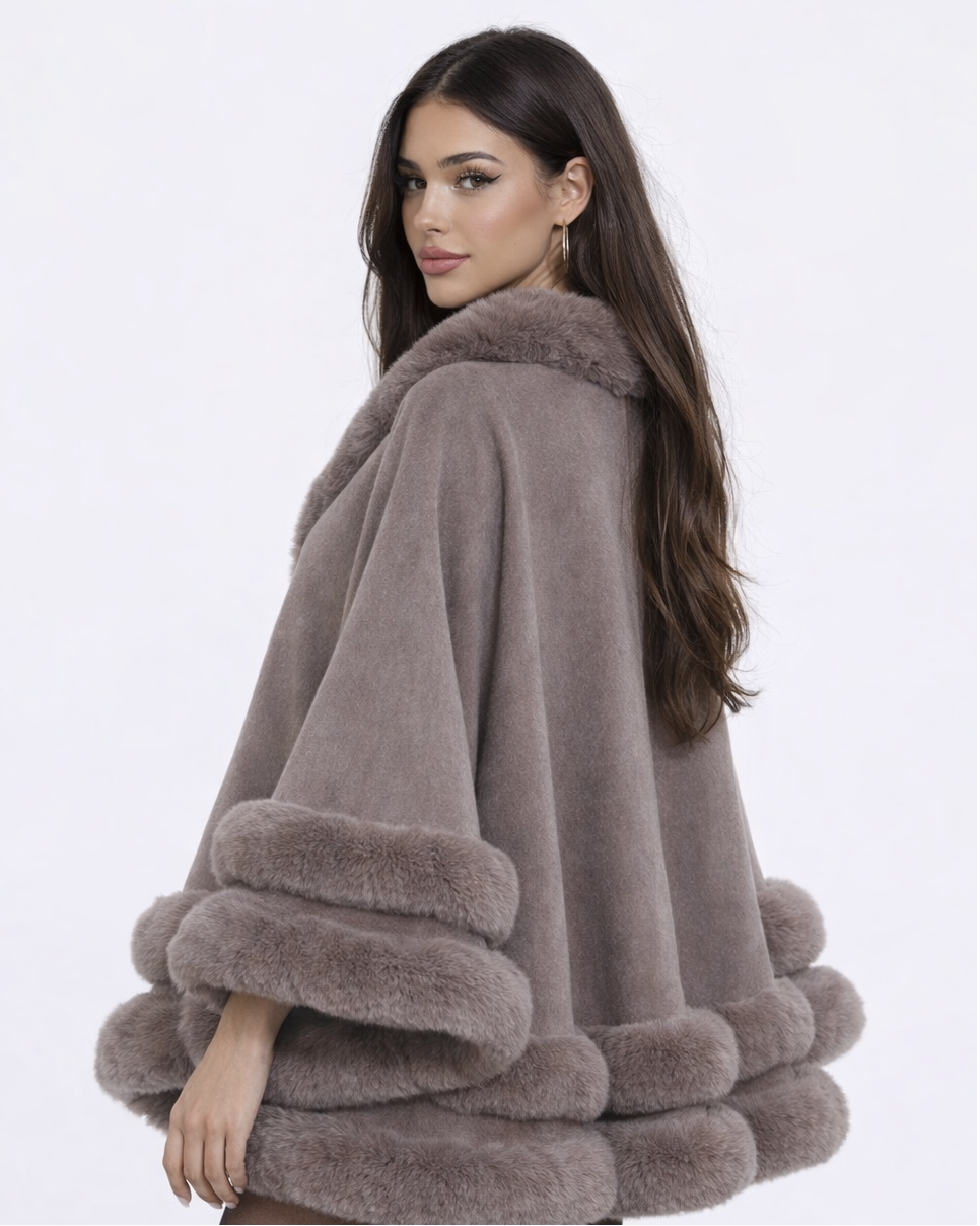 Elevate your style with our high quality Eleonora, the most elegant and must-have accessory for this autumn/winter — made for the girl who walks in and instantly becomes the most beautiful in the room. Designed in a chic batwing cape silhouette and finished with luxurious faux-fur trim, this statement piece delivers that rich, healthy, main character energy in the most effortless way. Perfect for cozy layering, city days, and glamorous cold-weather moments.