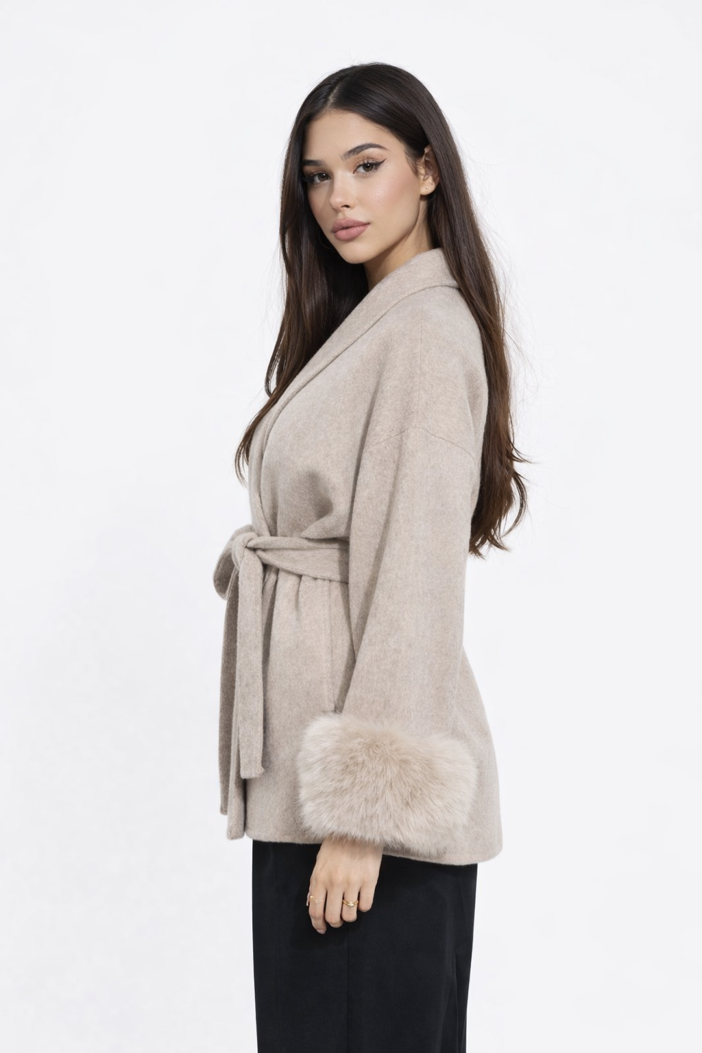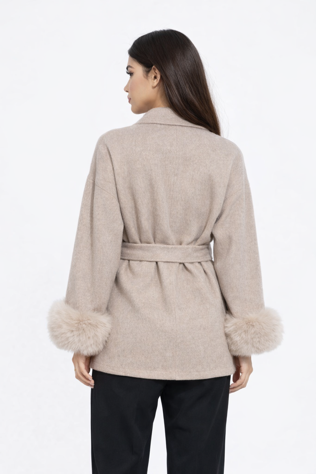 Elevate your style with our high quality Victoria Moss Wool Coat, a timeless and feminine wardrobe essential made for you walk in and instantly become the most beautiful in the room. it enhances your figure while keeping you cozy and effortlessly chic. Finished with plush synthetic faux-fur cuffs for that rich, healthy, main character energy. Perfect for elevated daywear or elegant evening looks.